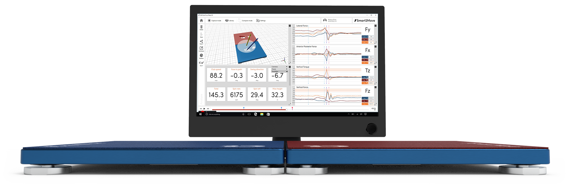 From the main interface, you can visualize data from the force plates through the 3D render charts, read the curves graphs, display the Trackman numbers and play the high speed video(s) synchronized with force plates data.